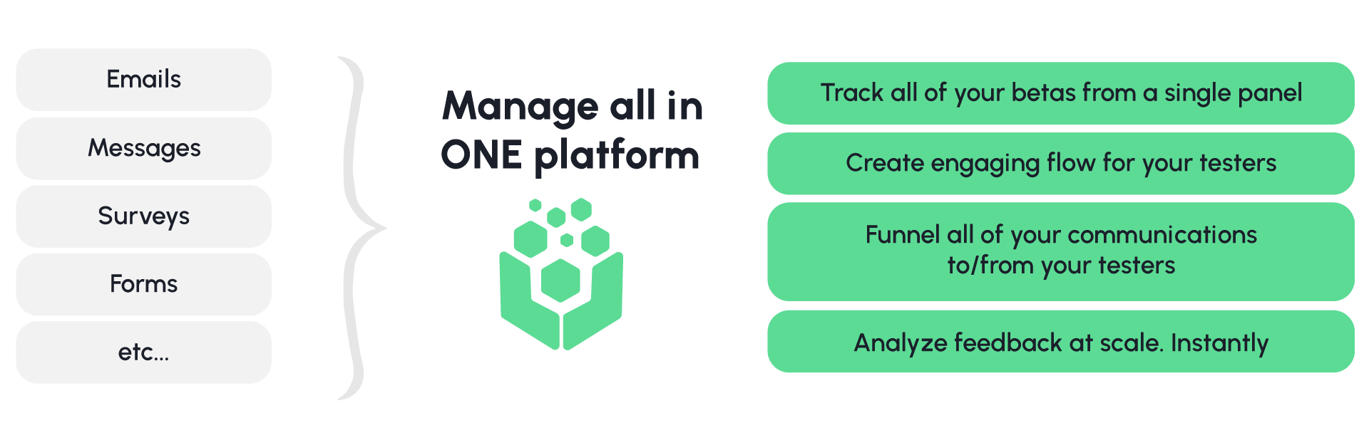 Existing tools are not working for product teams. They work individually, but as a collective they don’t. I interviewed a product person who cited 3 different spreadsheets just to track where everything is! I’ve seen 20+ page internal documents trying to put order to the chaos. I’ve heard a product person contemplating skipping beta testing altogether because it’s just too cumbersome to manage... The horror stories went on and on so it was clear to us how to solve the problem: a one-stop platform that brings all of those aspects of the process in one place and integrates seamlessly in the current workflow (stay tuned for the integration part!)