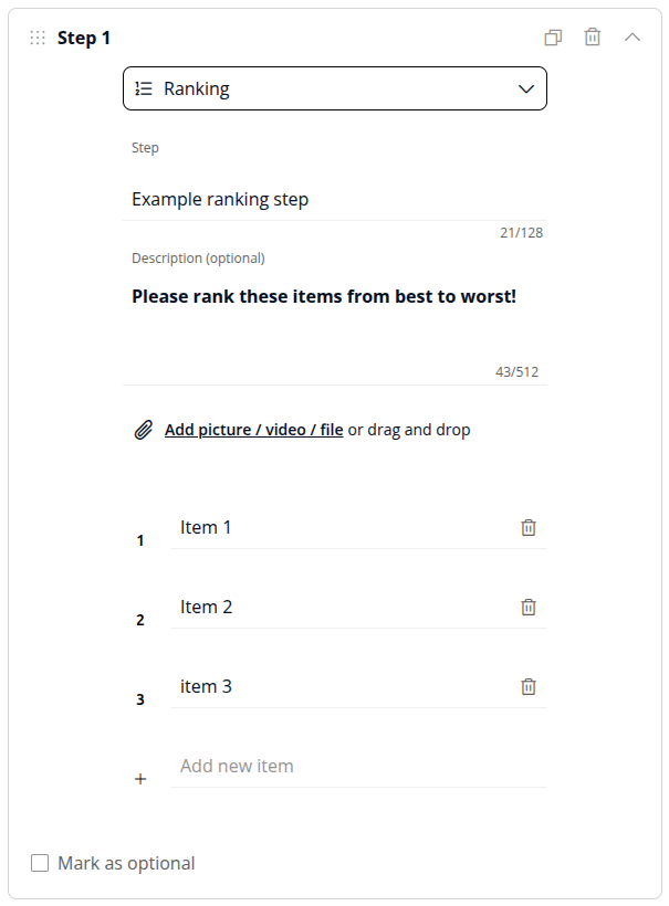 Click "Add Step" and select Ranking from the drop-down. Give it a clear title like "Rank These Feature Ideas from Most to Least Exciting."