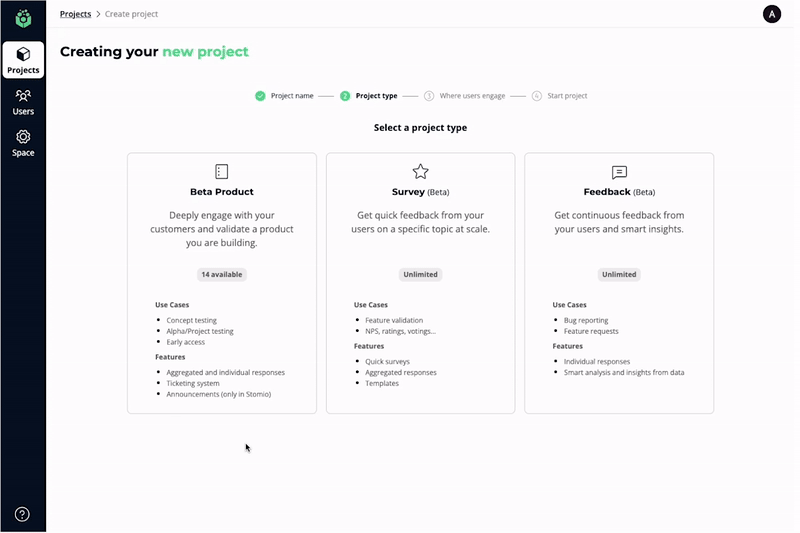 In this post we will explore how easy it is to create a new project in Stomio. Whether it’s a Beta project, Feedback project, or a Survey, creating a project pretty straightforward.