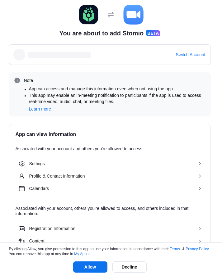 - Stomio account admin must install the Zoom integration using a Zoom account with admin privileges.
