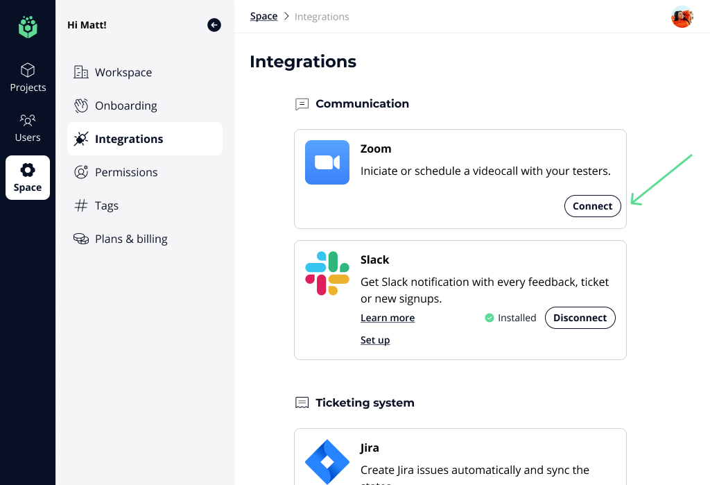 As an Admin, navigate to the Space→Integrations. Enable Zoom integration by clicking on “Connect” next to Zoom. This action will direct you to Zoom so you can login your account.