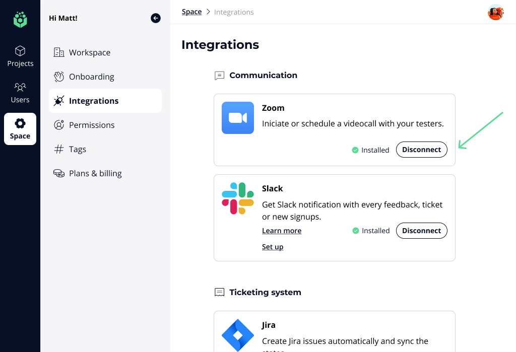 As an Admin, navigate to the Space → Integrations. Disable Zoom integration by clicking on “Disconnect” next to Zoom and click in Disconnect.