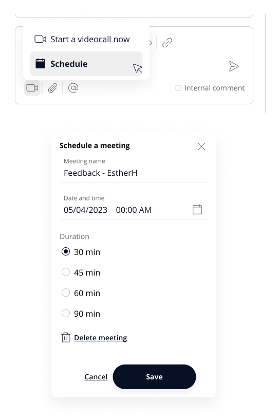 You can delete your scheduled call by clicking on “Edit meeting” then click “Delete meeting” and confirm the action.