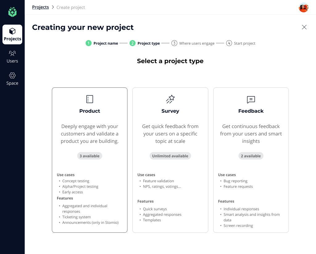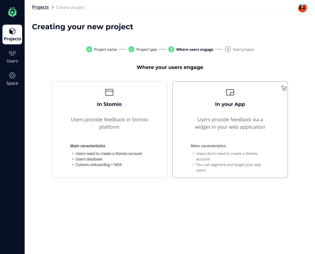 When creating a new Stomio Project, the next step after selecting a meaningful name, you need to decide if it will be running within the Stomio App (we call this type: Stomio) or within a SaaS application using the widget (we call it In APP) . One of the most significant distinctions is the user experience. When using the Stomio App, your users are required to sign up and create a Stomio account. On the other hand, when utilizing the widget, they are already logged into your App, allowing them to directly provide feedback without any additional steps.